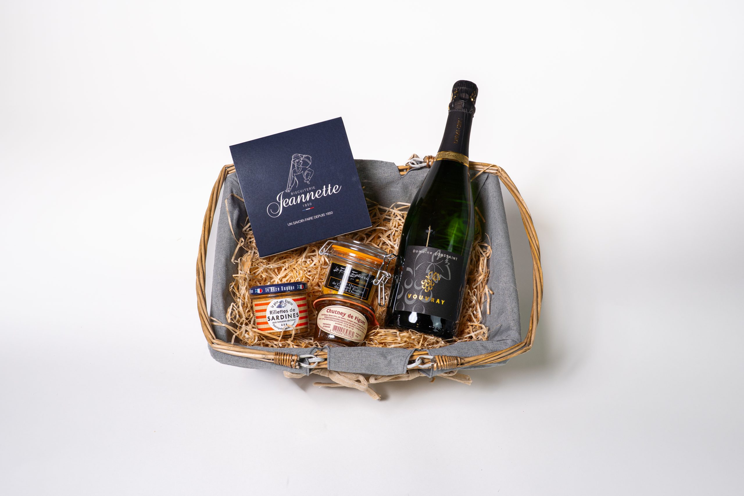 Un coffret élégant pour les gourmets : Vouvray pétillant 75cl, foie gras de canard 80g, confit de figues ou oignons, rillette de la mer (90g), et macarons de Cormery. Une valeur sûre pour faire plaisir.